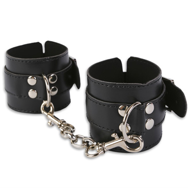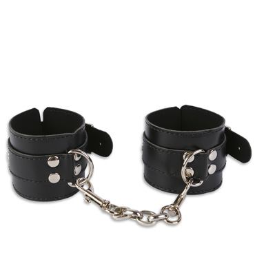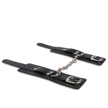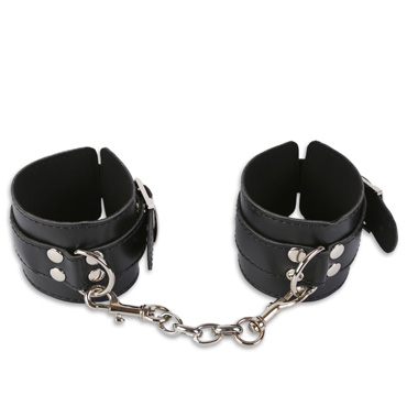 Широкие манжеты из коллекции БДСМ-аксессуаров отечественного производителя. Они выполнены из прочной натуральной кожи. Манжеты застегиваются при помощи ремешков, которые прикреплены надежными металлическими заклепками. Размер манжет можно регулировать пряжками. Между собой наручники соединяются короткой цепочкой с карабинами