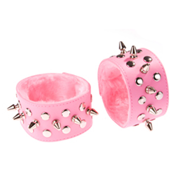 Наручники изготовлены из искусственной кожи в розовом цвете. При изготовлении использована никелированная фурнитура. Эффектный цвет и внушительные шипы станут отличным дополнением к вашему образу. Ремешки регулируются.