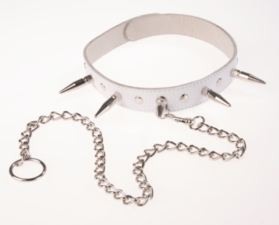 Белый кожаный ошейник, декорированный шипами в стиле BDSM. Цепочка-поводок входит в комплект и при необходимости легко отстегивается карабином. Универсальный аксессуар для самых различных ситуаций, как в постели, так и за ее пределами.