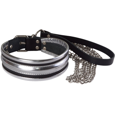 Яркий сверкающий ошейник из натуральной кожи с поводком-цепочкой. Размер регулируется ремешком. цепоцка длиной 80 см крепится к кольцу на ошейнике.