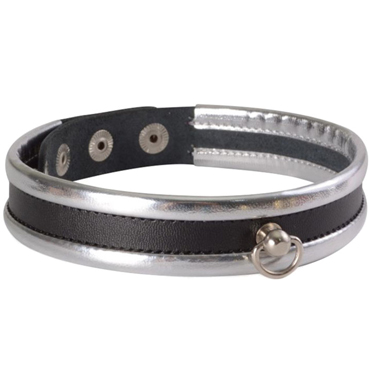 Яркий сверкающий ошейник из натуральной кожи с кольцом для крепления поводка или цепи. Размер регулируется ремешком.