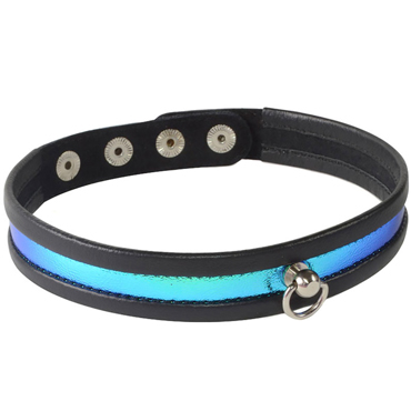 Переливающийся сине-зеленый с черной окантовкой ошейник из натуральной кожи с кольцом для крепления поводка или цепи. Размер регулируется ремешком.