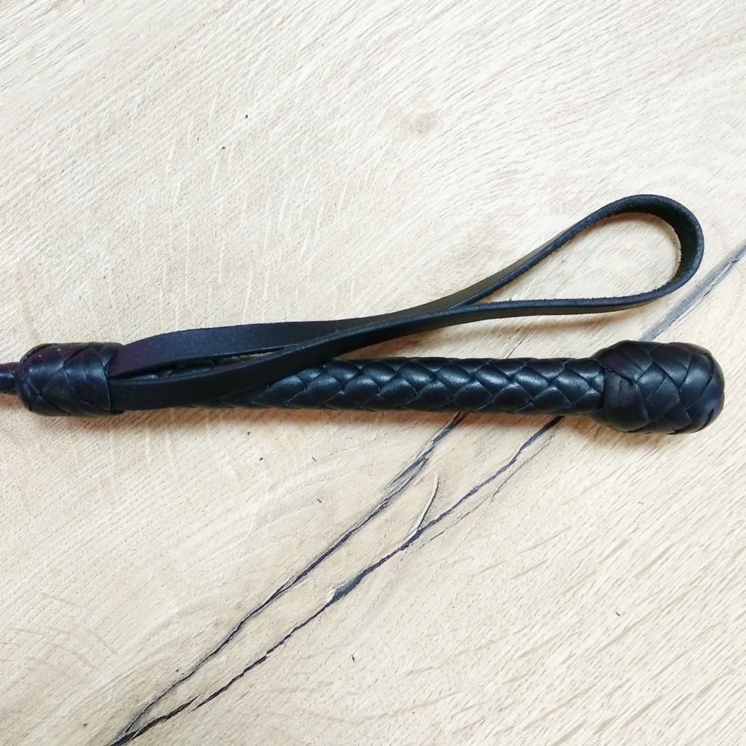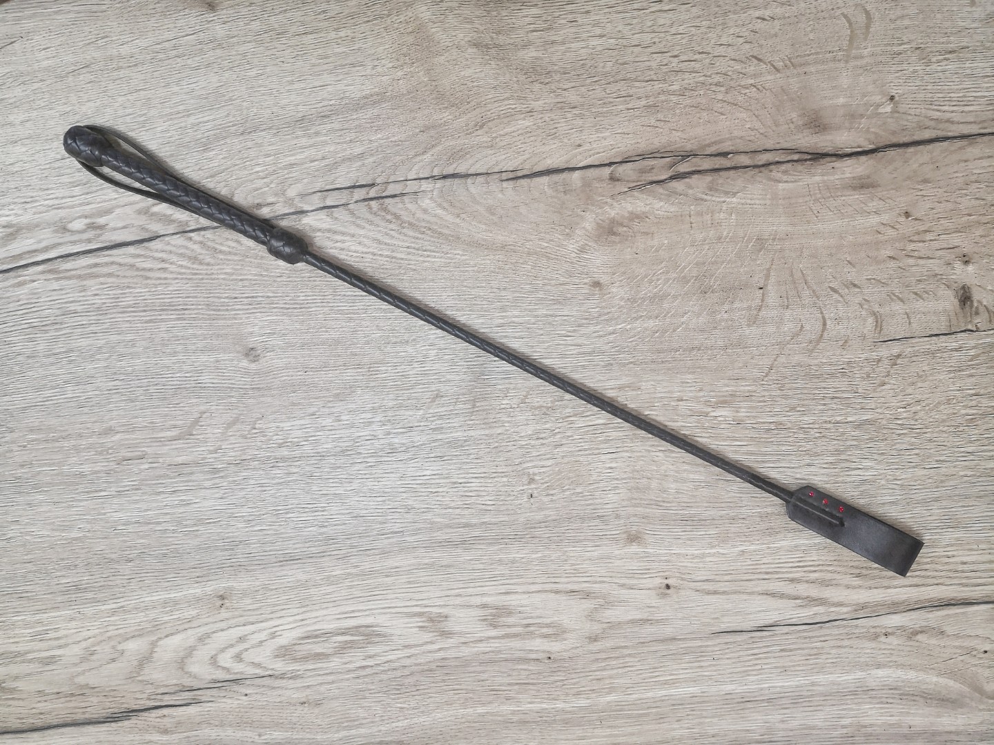 Стек выполнен из кожаных полос, аккуратно сплетенных между собой на стержне. На конце имеет плоский наконечник, украшенный сверкающими кристаллами Swarovski алого цвета. На рукояти есть петля для надежной фиксации в руке. Вы по достоинству оцените шлепки этим девайсом :)