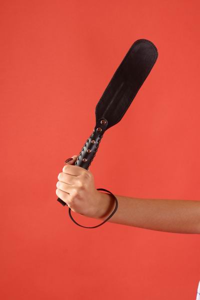 Удобная черная хлопалка в форме удлиненной узкой лопатки с комфортной ручкой – неуемная интимная игрушка и неотъемлемый возбуждающий атрибут в спальне активных поклонников БДСМ. Изящная модель из натуральной кожи отличается искусной ручкой с металлическими заклепками, обплетенной по швам косыми стежками. Сама шлепалка тщательно обработана и прошита по краям, дополняется специальной петлей, позволяющей надежно зафиксировать дерзкую игрушку в руке.