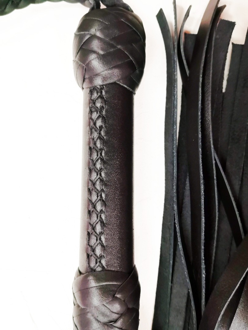 Короткая плеть с ручкой черного цвета. В меру опасная, поможет вам испытать неописуемые чувства удовольствия и наслаждения. Яркие эмоции не заставят вас долго ждать вместе с черным кожаным стеком!!! Бурная ночь для вас обеспечена!!!