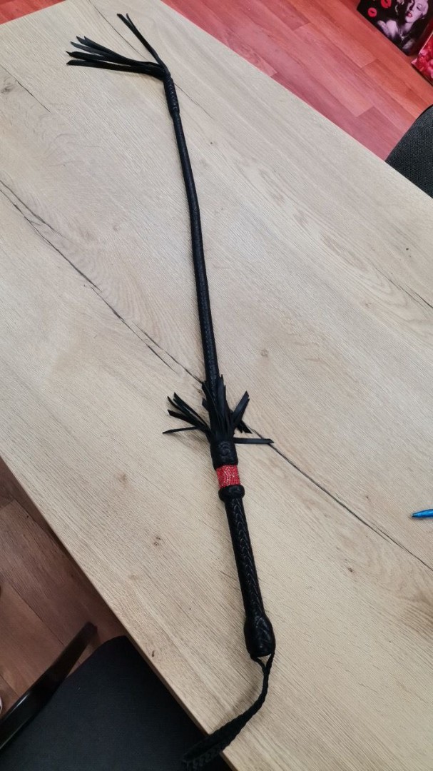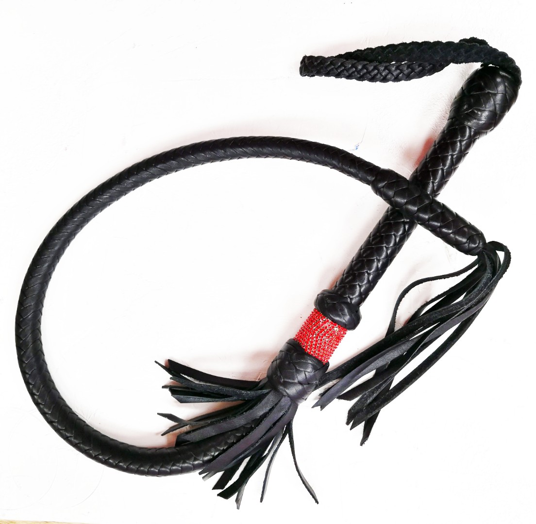 Черный короткий кнут из натуральной кожи ручной работы, декорированный кисточкой. Также имеет плетеную ручку и петельку для удобного использования. Прекрасно подойдет не только для БДСМ-игр, но и для необычного массажа.