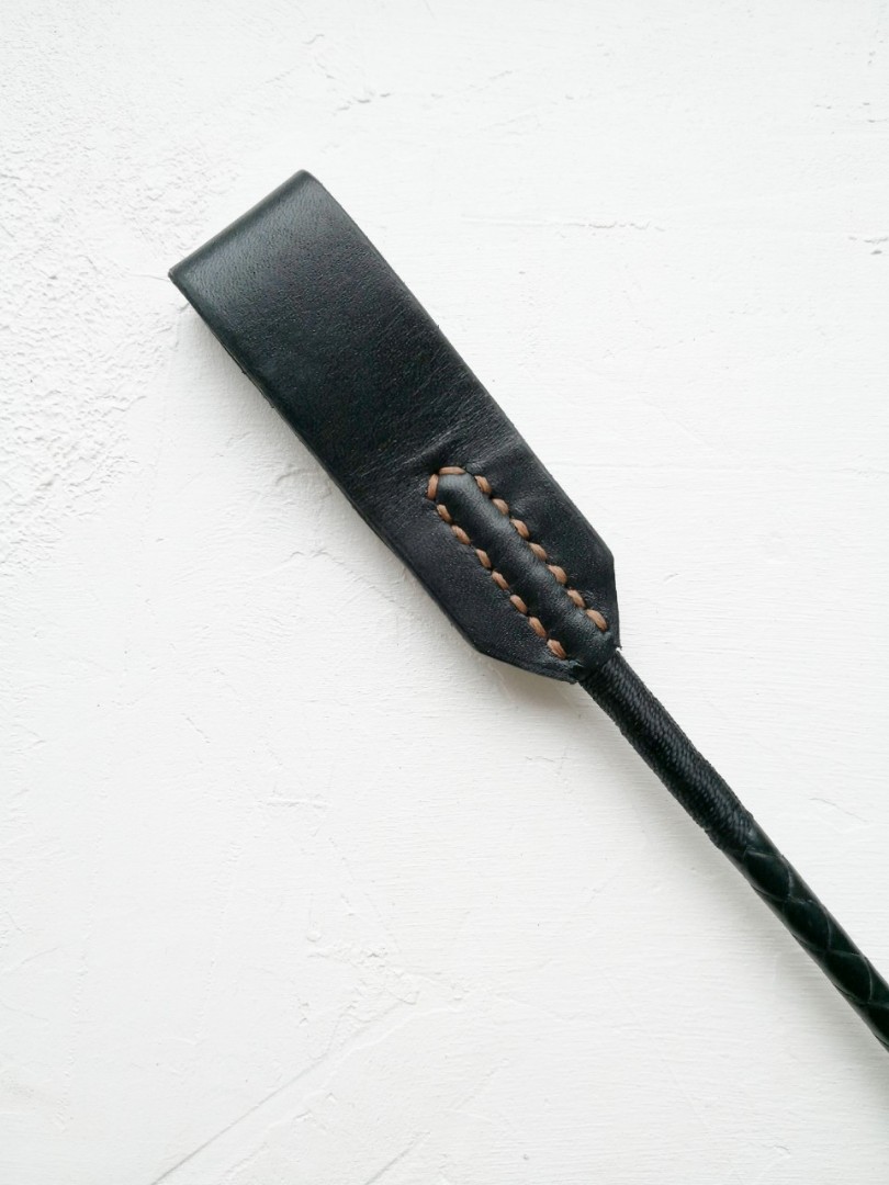 Короткий стек из кожи с плетеной ручкой, декорированный черной нитью