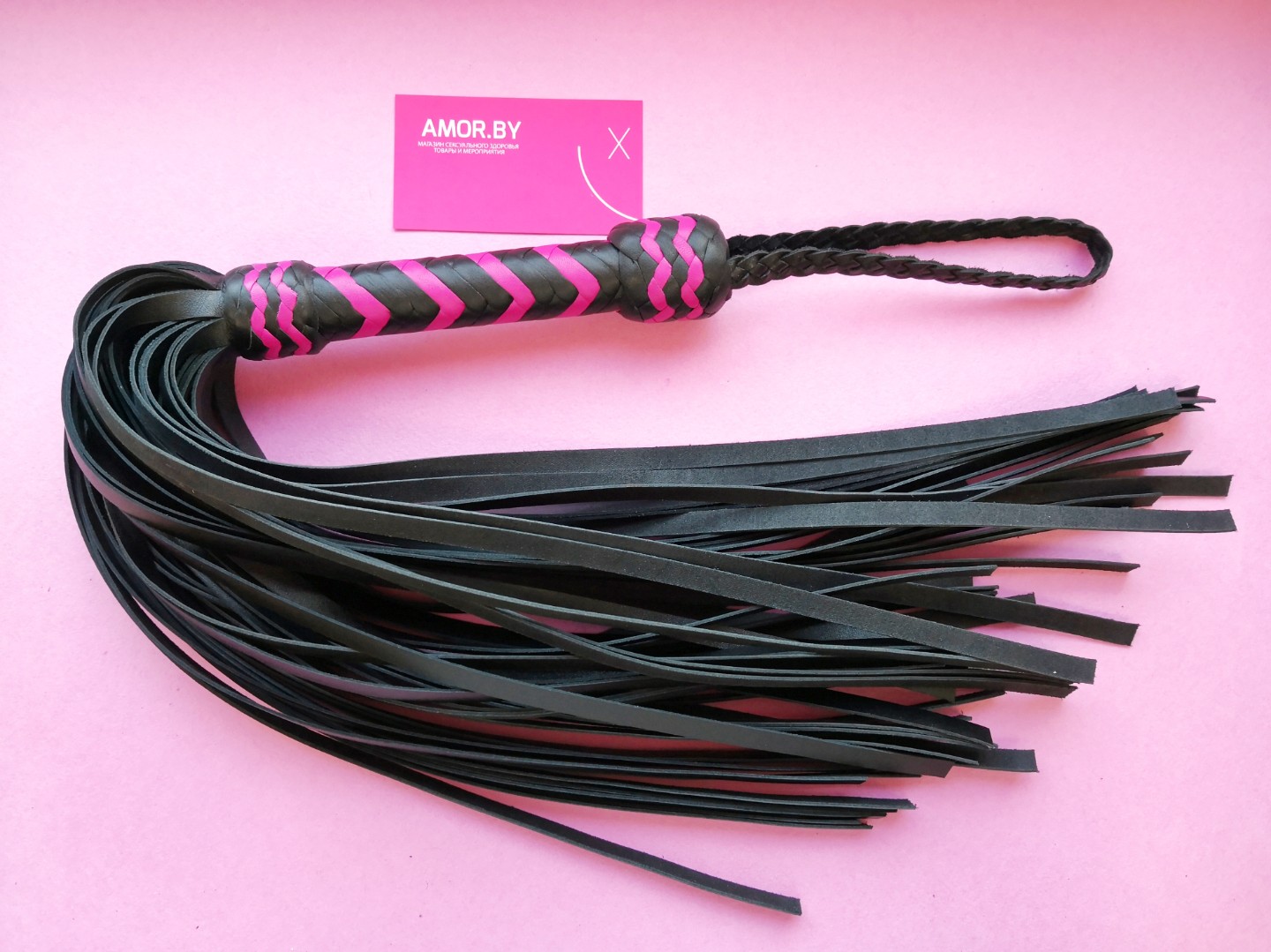 Удобная, плеть-флоггер ручной работы черного цвета с розовой оплеткой ярко-розового цвета на ручке выполнена из натуральной кожи. Станет безумно приятный аксессуаром в любовных играх. Ей не только можно наказать, но и отмассажировать все тело вдоль и поперек