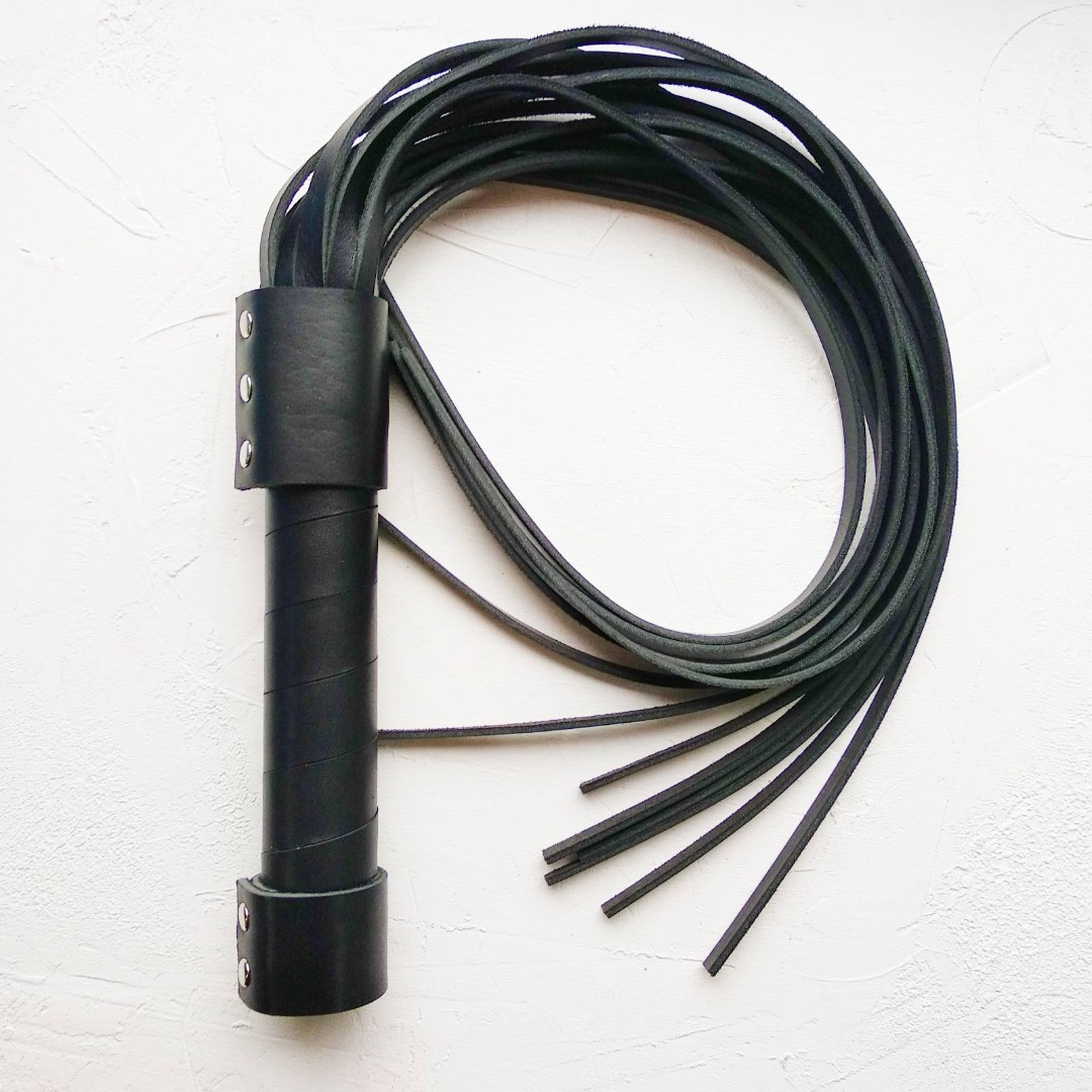 Черная кожаная плеть с 13 хвостами, длинною 45 см с рукоятью 19 см, декорированной заклепками.