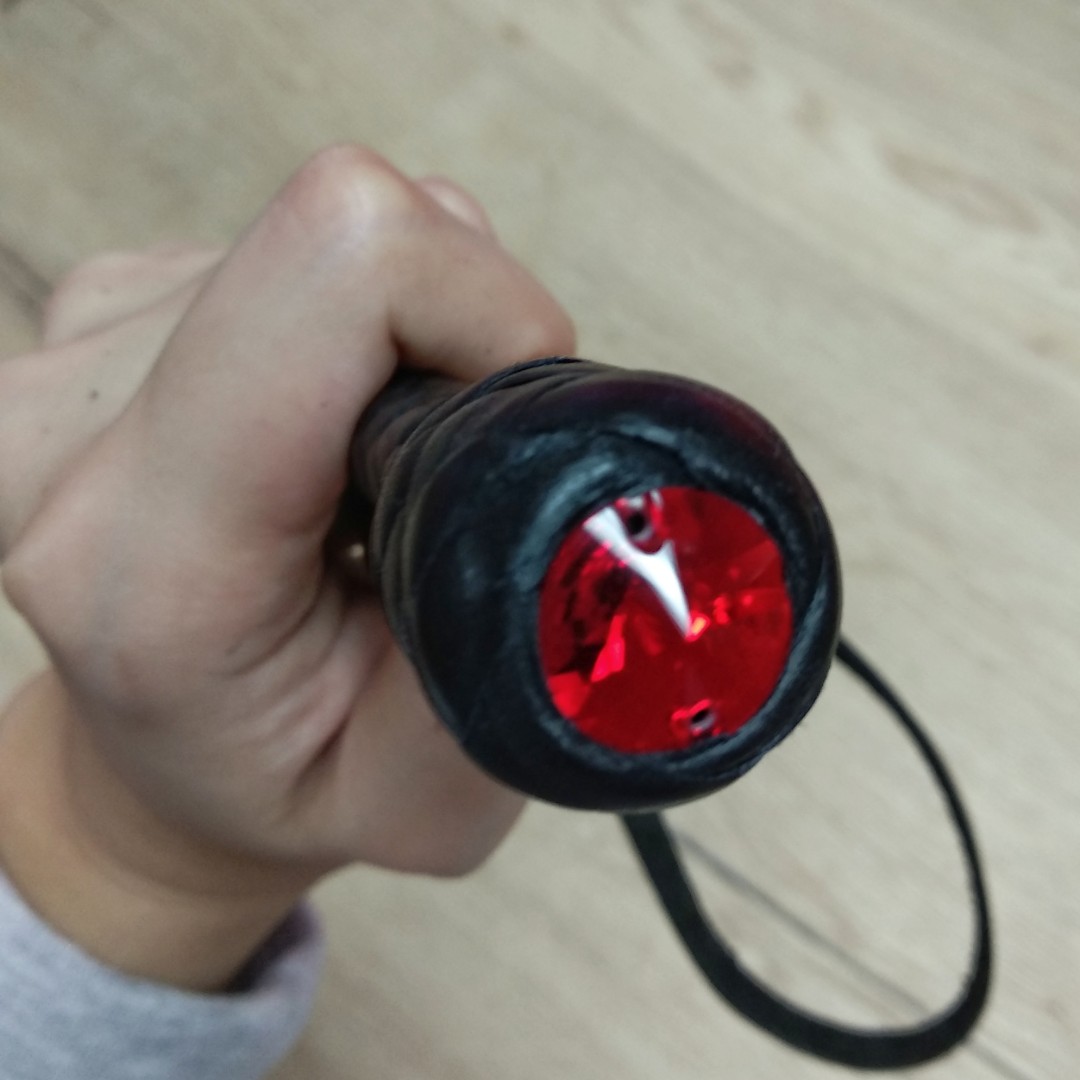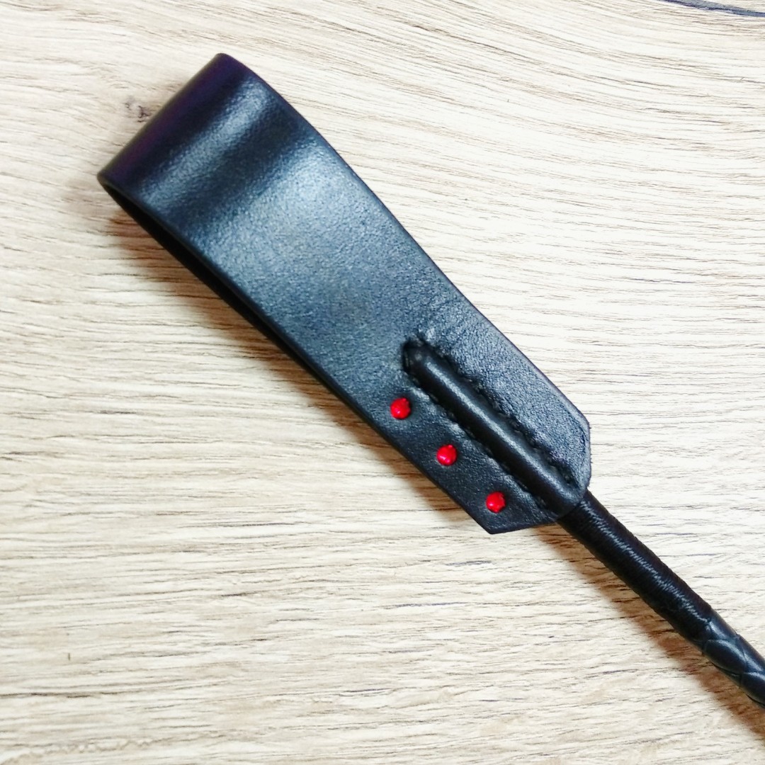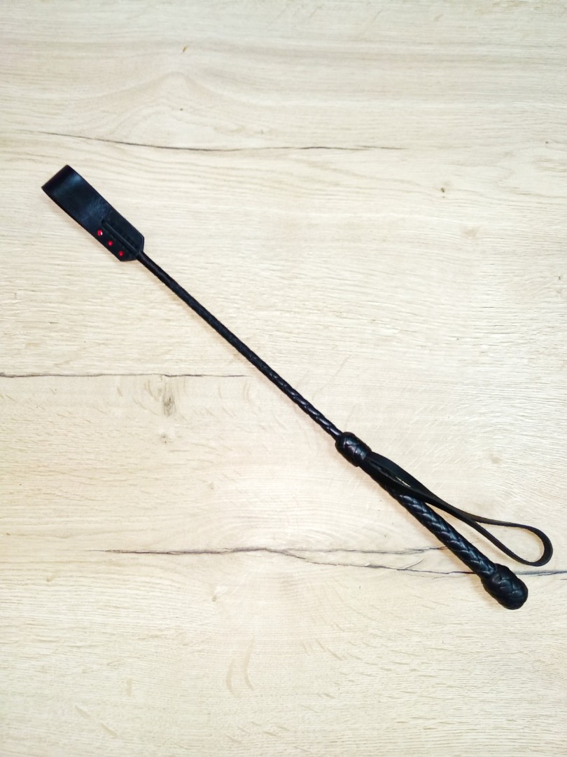 Стек выполнен из кожаных полос, аккуратно сплетенных между собой на стержне. На конце имеет плоский наконечник, украшенный сверкающими кристаллами Swarovski алого цвета. На рукояти есть петля для надежной фиксации в руке. Вы по достоинству оцените шлепки этим девайсом :)
