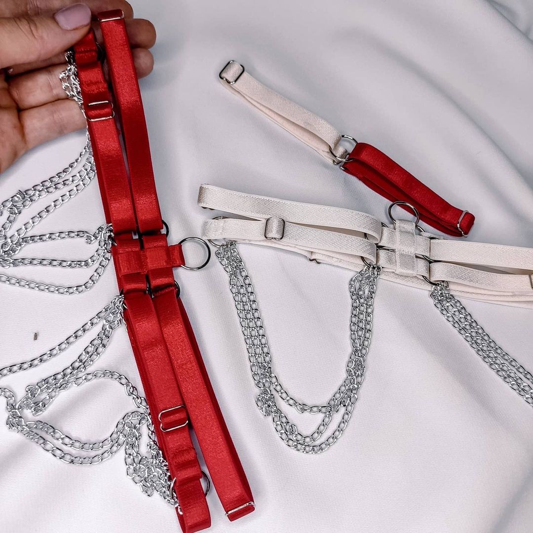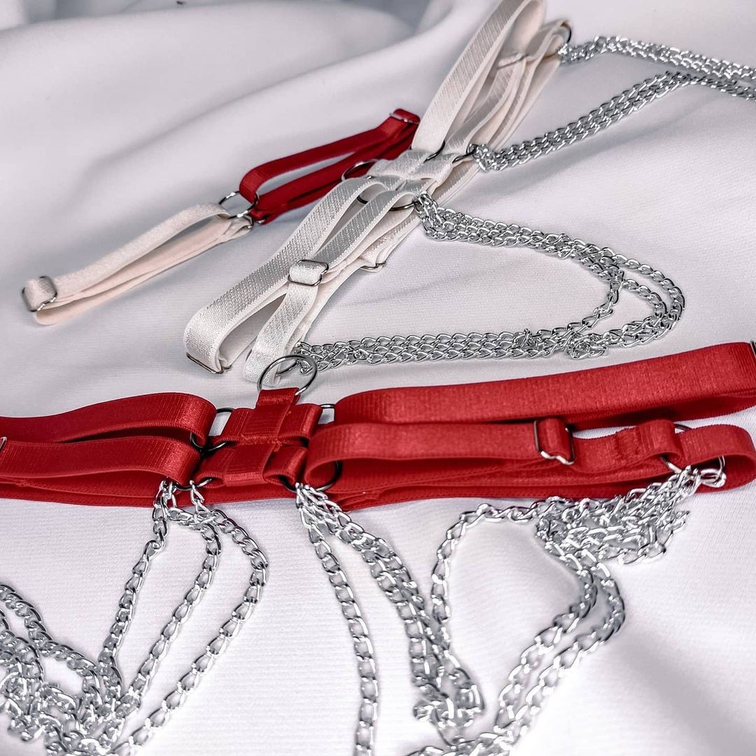 Стрепы — это сексуальный, чувственный аксессуар представляет собой сплетение тонких эластичных лент с небольшими вставками фурнитуры , которые могут начинаться от шеи и заканчиваться на бедрах, переплетая при этом все тело.