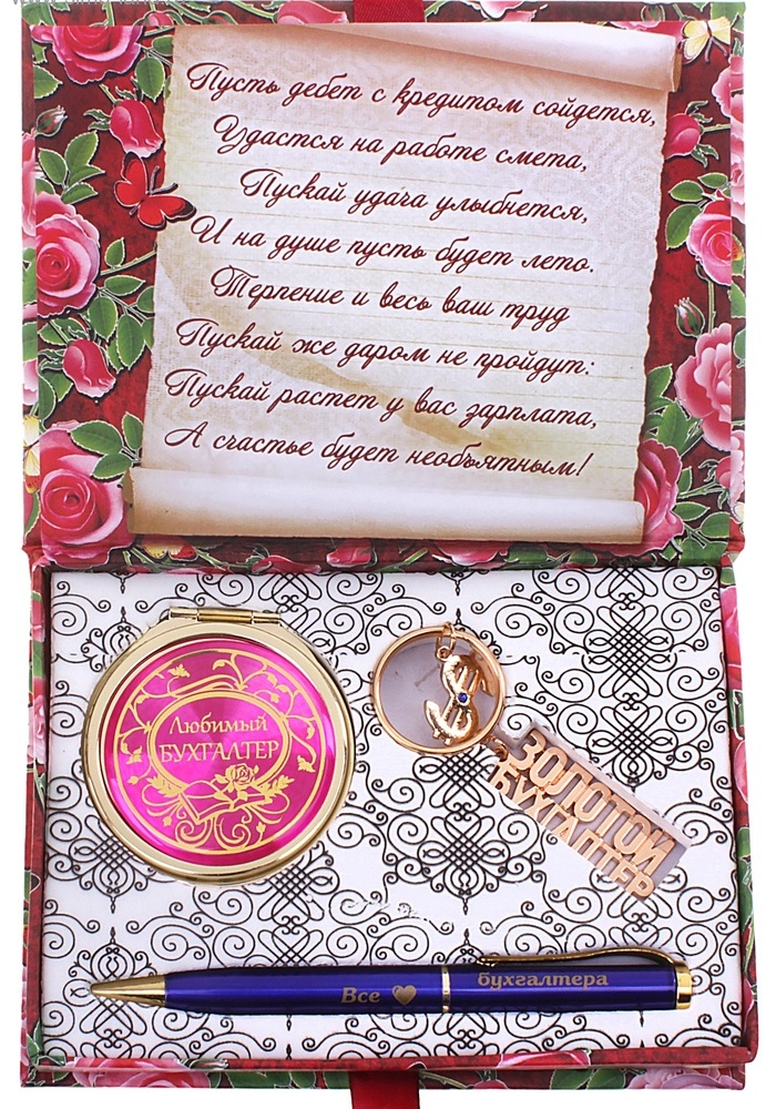 Вы всегда ломаете голову над тем, что же подарить своим сотрудникам или коллегам, а может быть, родным и близким? Отличный подарок для них – это набор «3 в 1»: брелок, ручка и зеркало. Любимому бухгалтеру компании отлично подойдет набор «Любимый бухгалтер». В набор входят: удобное зеркальце, которое всегда будет под рукой и поможет привести себя в порядок; ручка, которой всегда можно будет подписать важные документы; оригинальный и стильный брелок «Золотой бухгалтер», который всегда будет приятно продемонстрировать окружающим. Набор упакован в подарочную коробку, в которой его будет приятно подарить любому