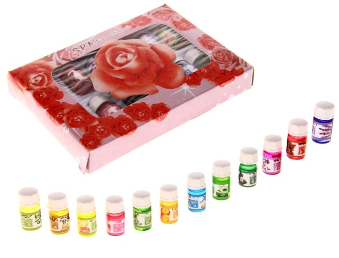 В набор входят масла с ароматами лимона, розы, апельсина, фиалки, лотоса, лаванды, зеленого чая, сандала, океана, жасмина, клубники и лилии.