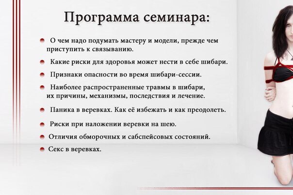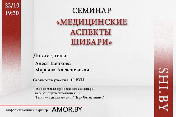 22 октября в 19.30, в Минске пройдет семинар по мидицинским аспектам шибари. Данный семинар будет полезен всем практикующим шибари.